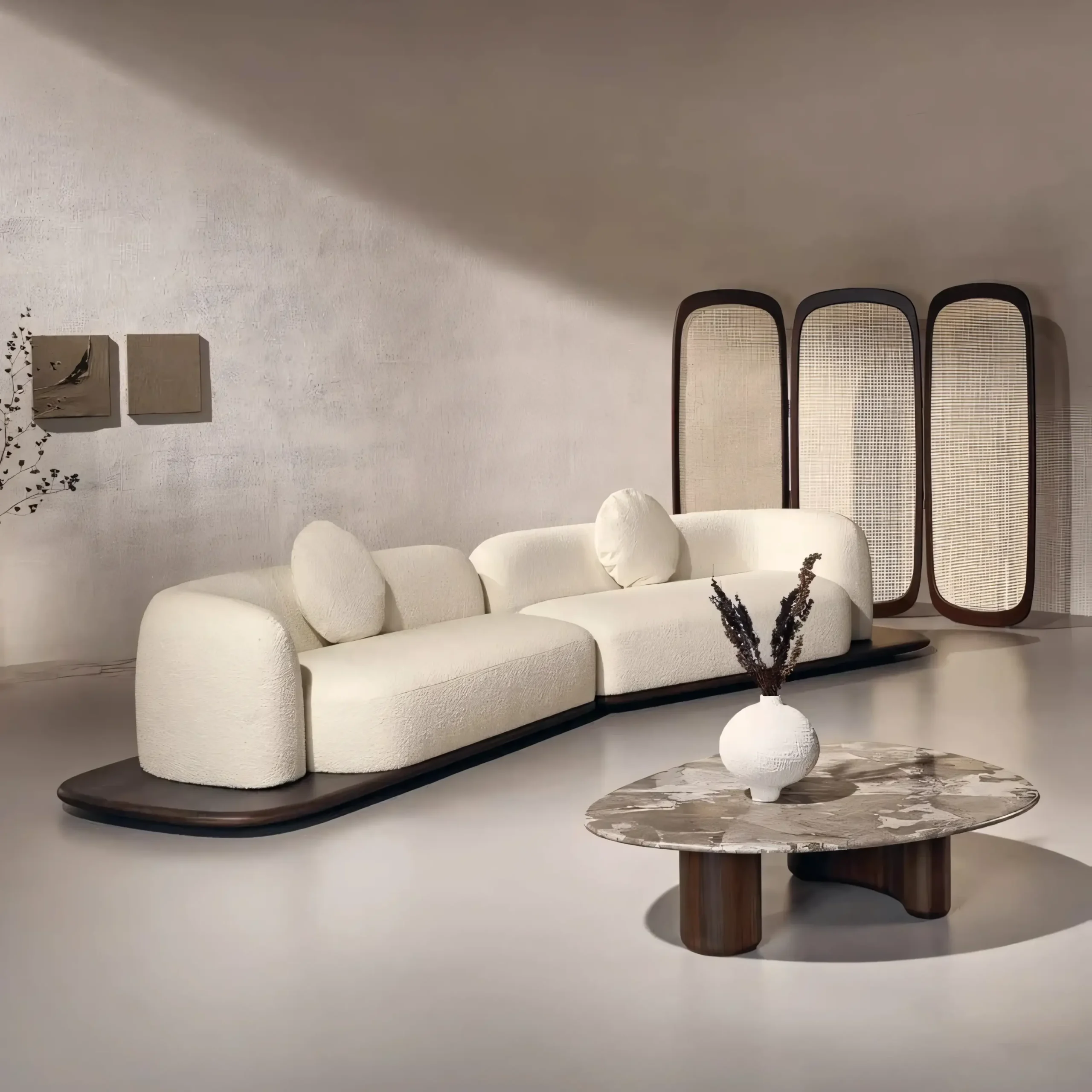 • Japandi Organic Curved Bouclé Sofa with Floating Wood Plinth