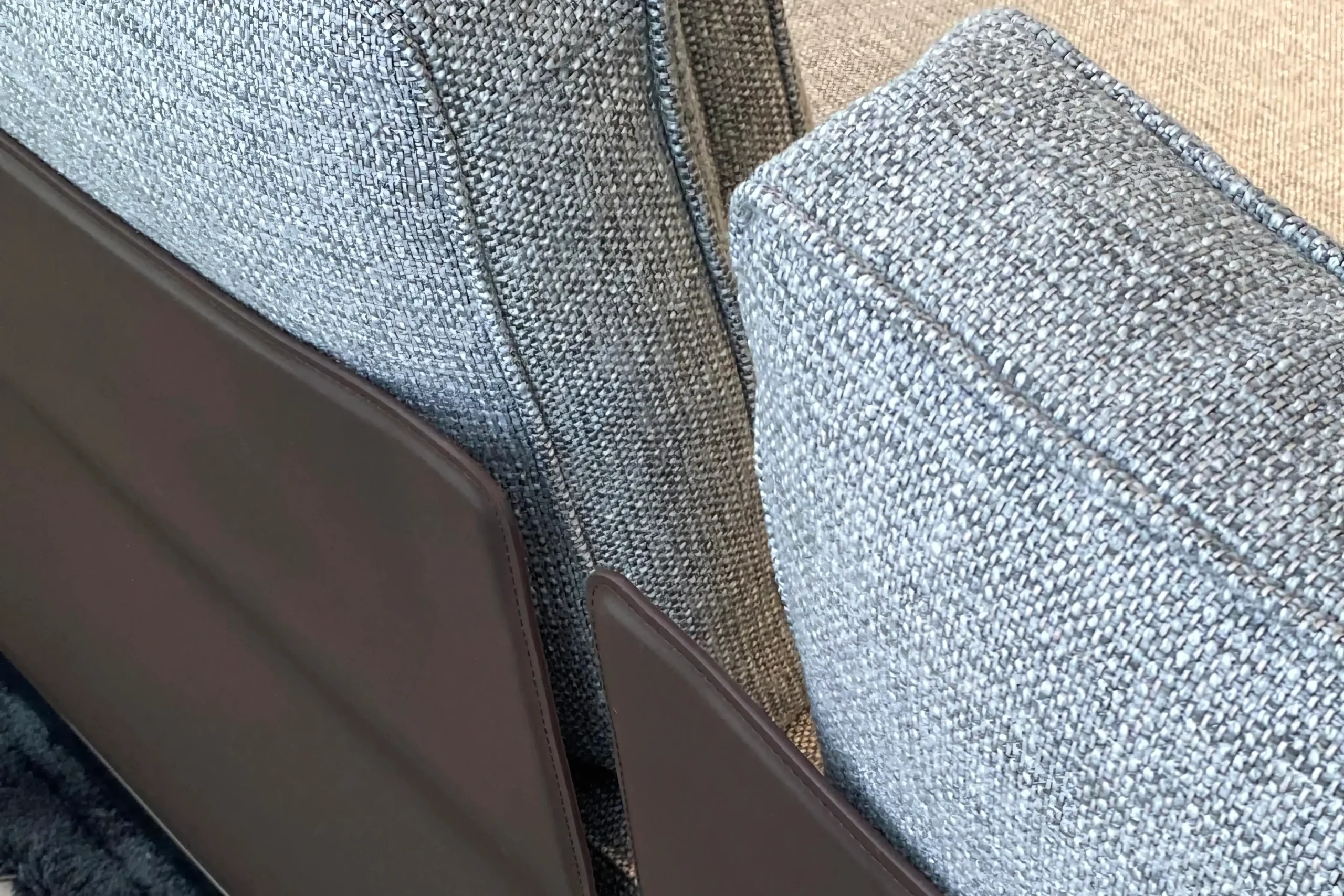 True luxury lies in the details. Every fabric cushion is framed with precise piping (welting) that accentuates the sofa's geometric silhouette. This tailoring technique not only reinforces the seams for heavy commercial use but also adds a crisp, bespoke aesthetic reminiscent of fine Italian leather goods.