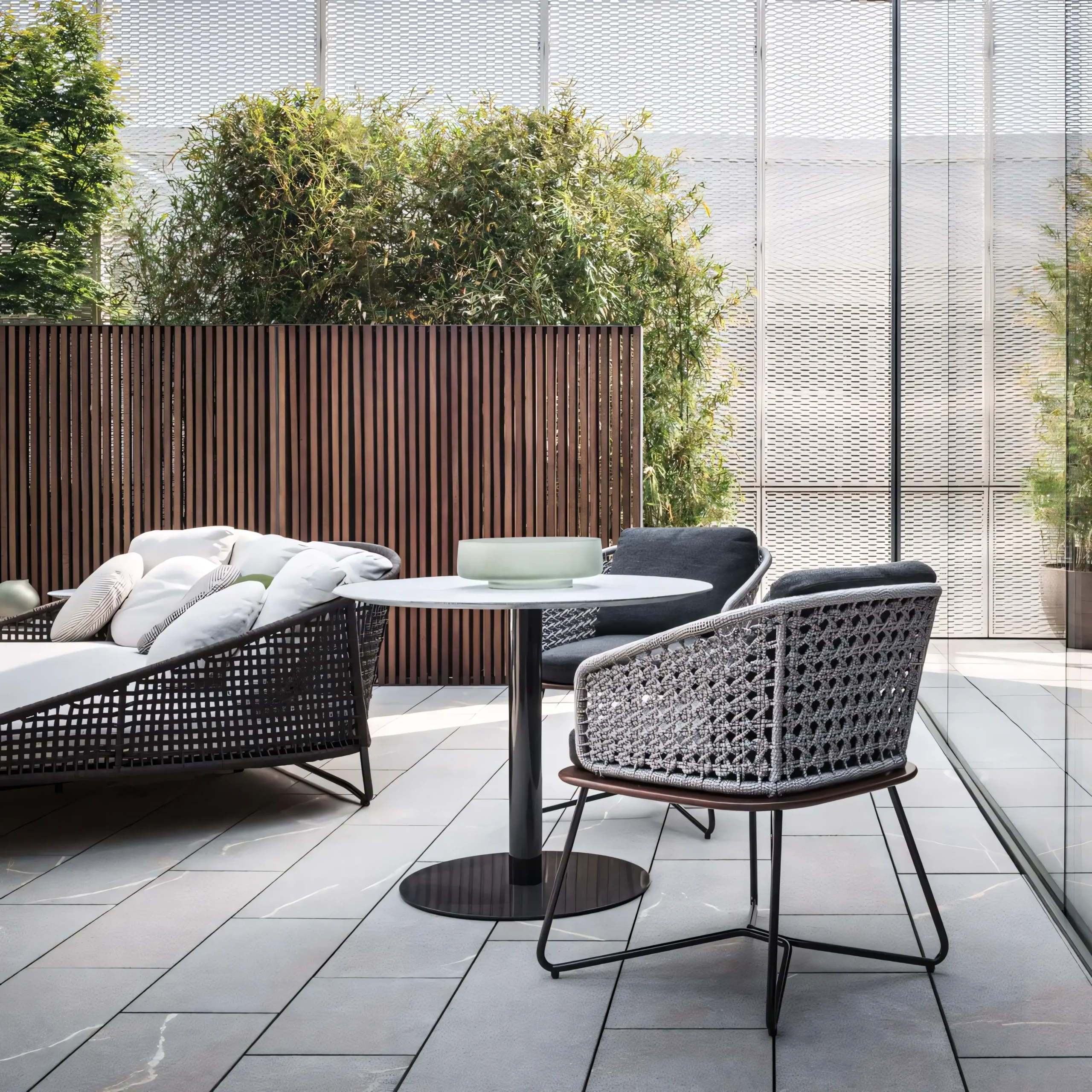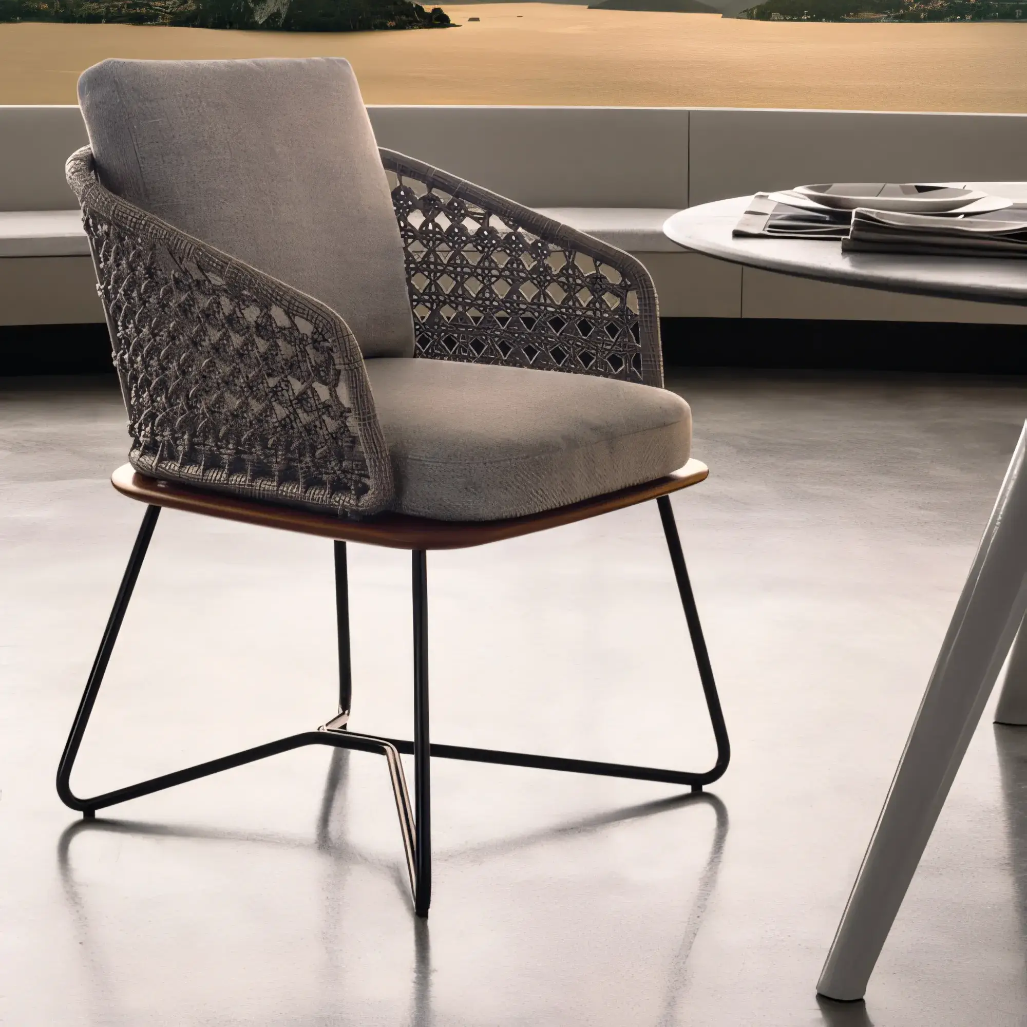 Features an intricate lattice weaving pattern using high-strength, UV-resistant nautical rope. Unlike traditional rattan, this soft-touch rope offers breathable back support and a sophisticated visual texture that resists fading or becoming brittle even under harsh sunlight.