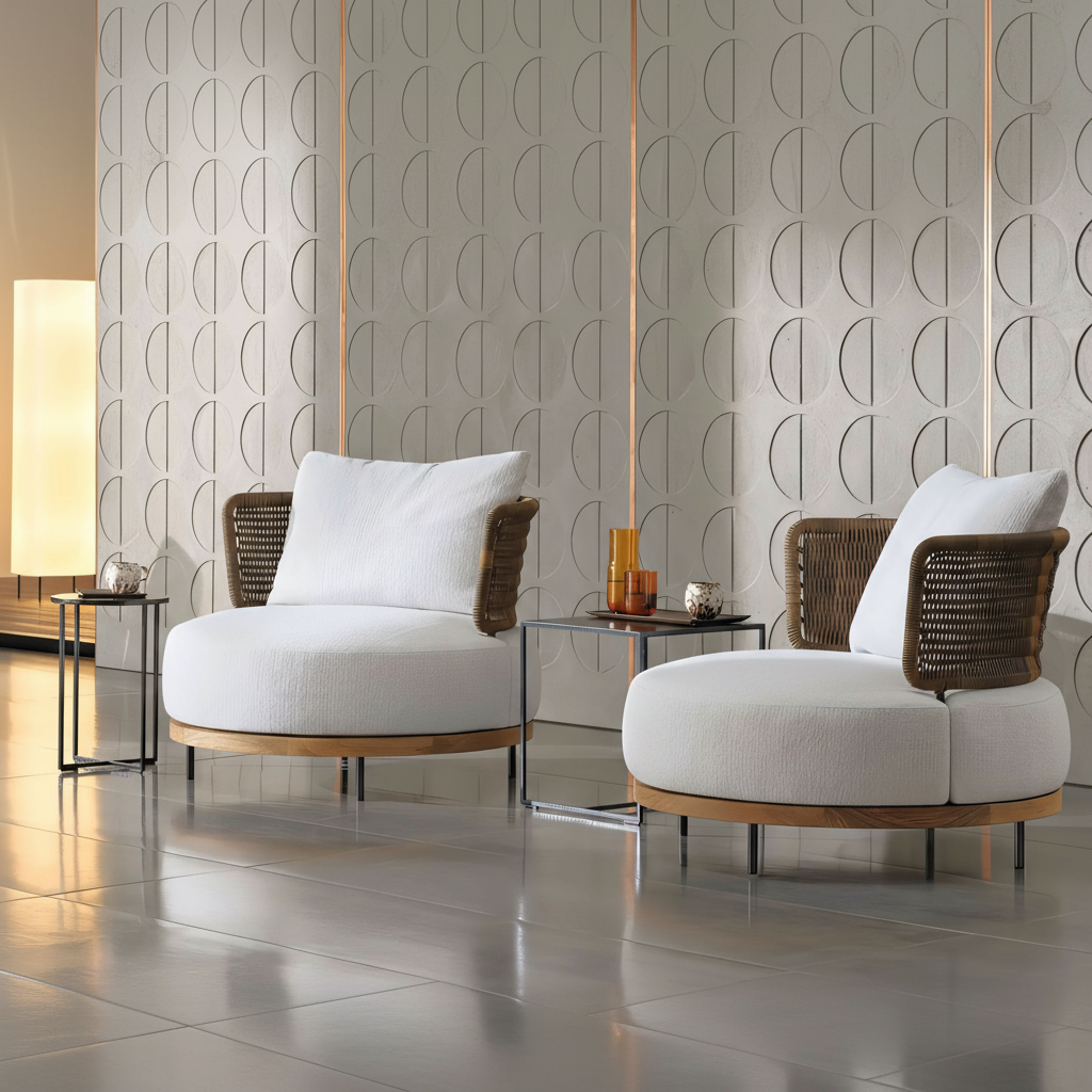 A robust powder-coated aluminum frame is wrapped in precision-woven olefin rope. This open-weave structure creates a visually light silhouette that allows air circulation, blending tactile warmth with industrial strength.
