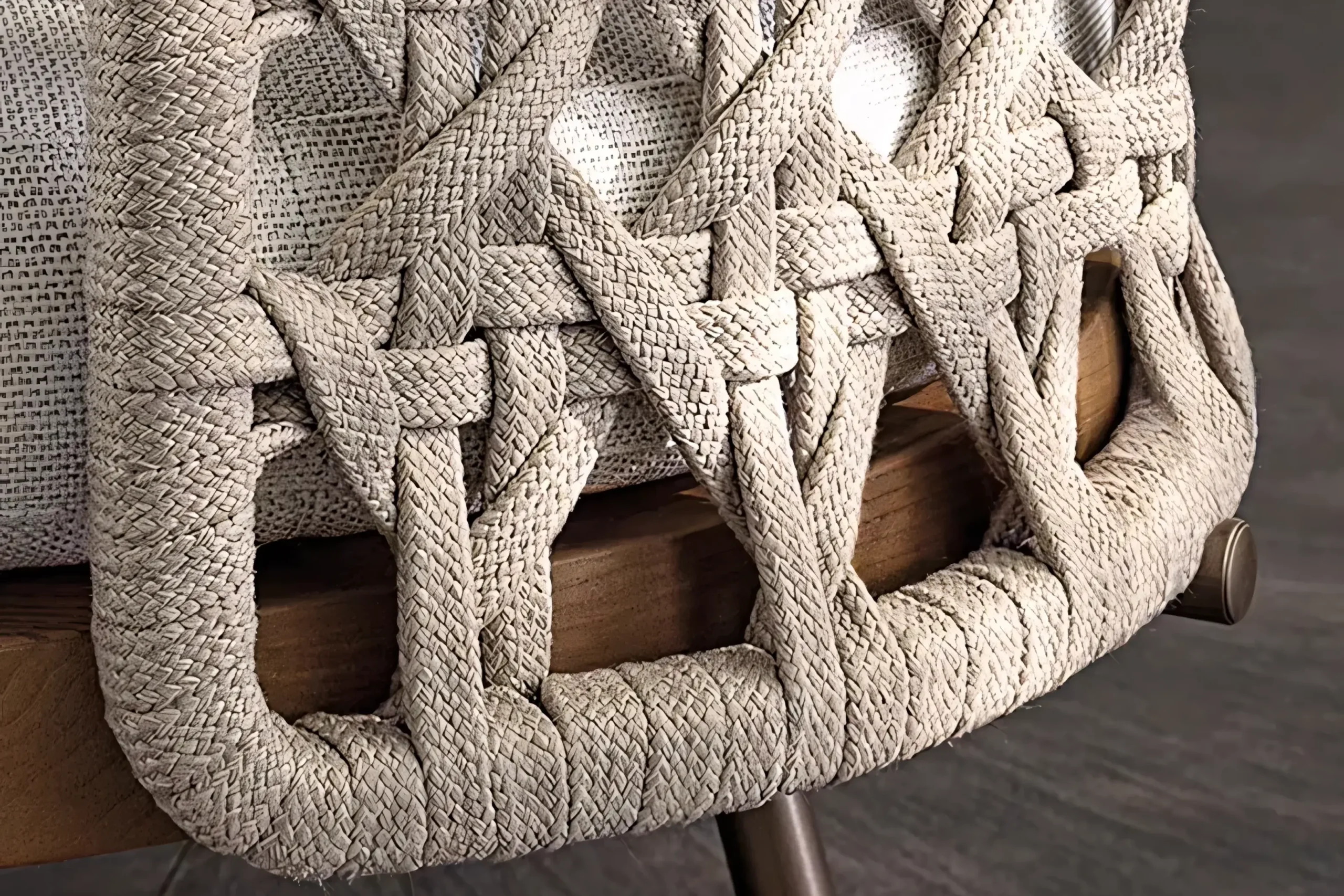 Hand-woven using weather-resistant olefin rope in a bold diamond pattern. This open-weave structure not only creates a stunning visual texture but also ensures breathability, keeping guests cool during hot summer days.