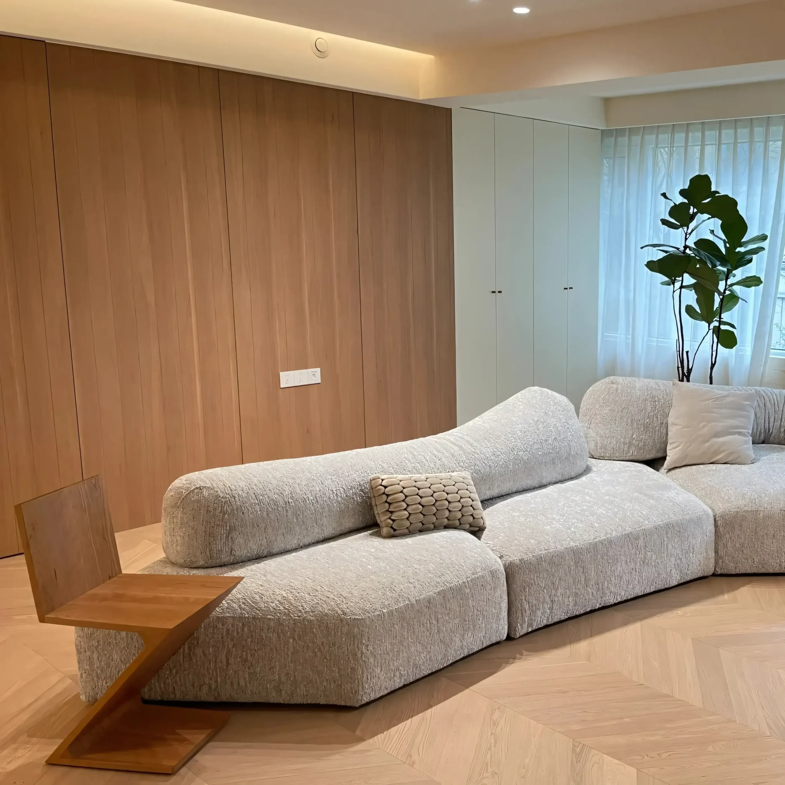 Redefine spatial freedom with this sculptural, island-style modular sofa system. Designed for versatility, it features irregular geometric bases paired with independent, weighted backrests that can be positioned anywhere on the platform. The backrests utilize a heavy-duty counterweight system and specialized non-slip bottom fabric to provide stable support without the need for mechanical fixation. Upholstered in durable, high-tactile textured fabric and filled with multi-layered high-density resilience foam, this sofa offers a perfect balance of sinking comfort and lasting shape retention. An ideal centerpiece for large open-plan living rooms, hotel lobbies, or commercial lounge areas seeking a fluid, contemporary aesthetic.