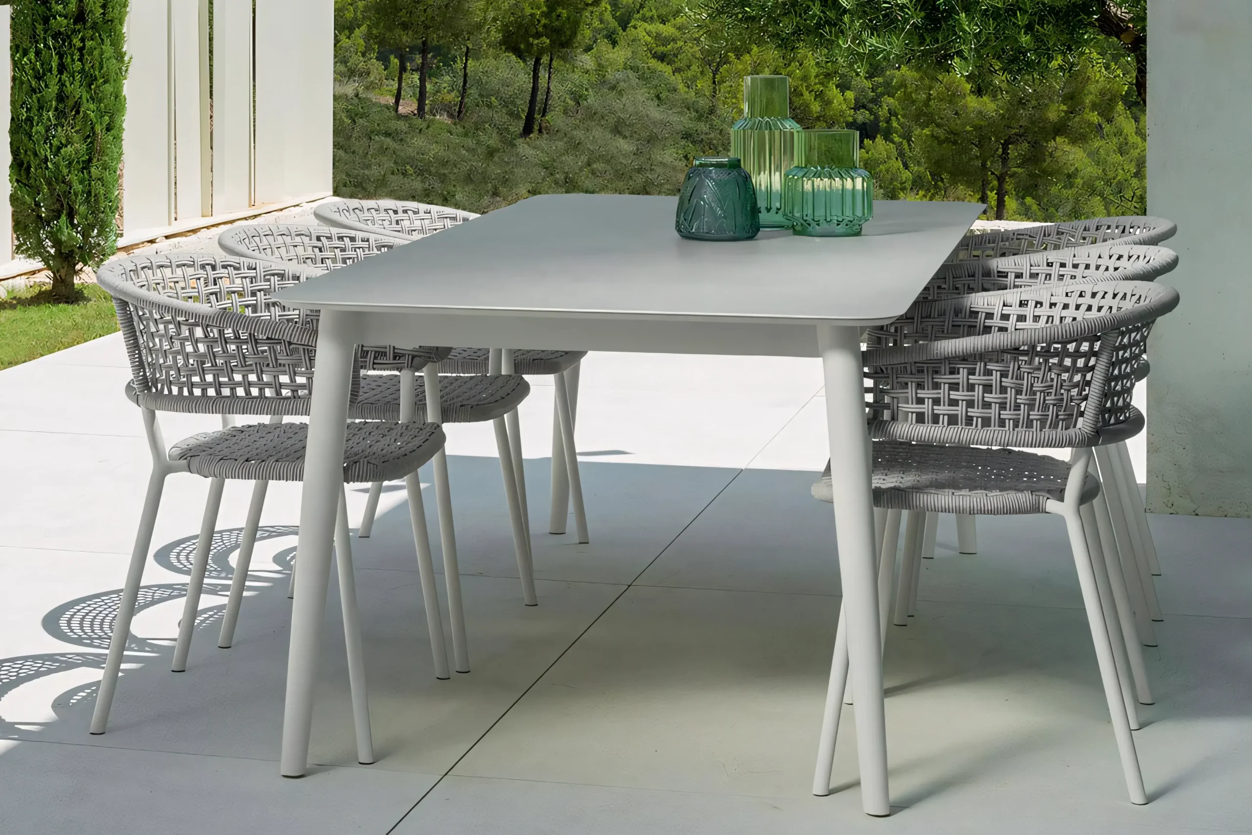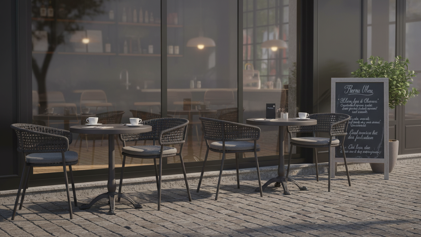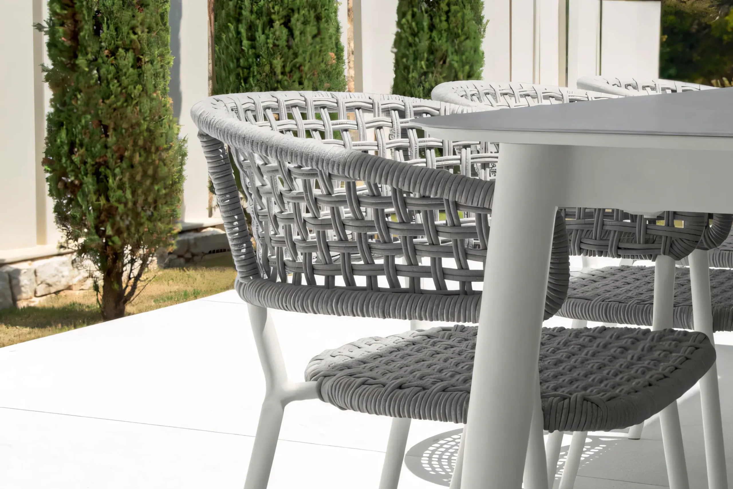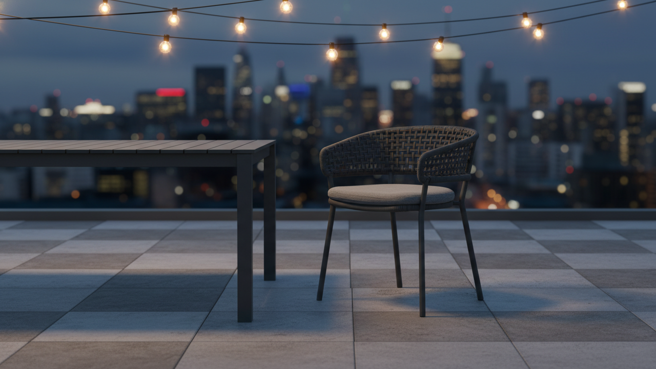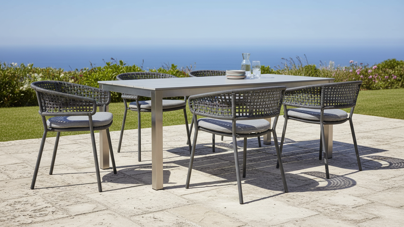 A commercial-grade dining solution blending tactile luxury with uncompromising weather resistance for hotels and private estates.