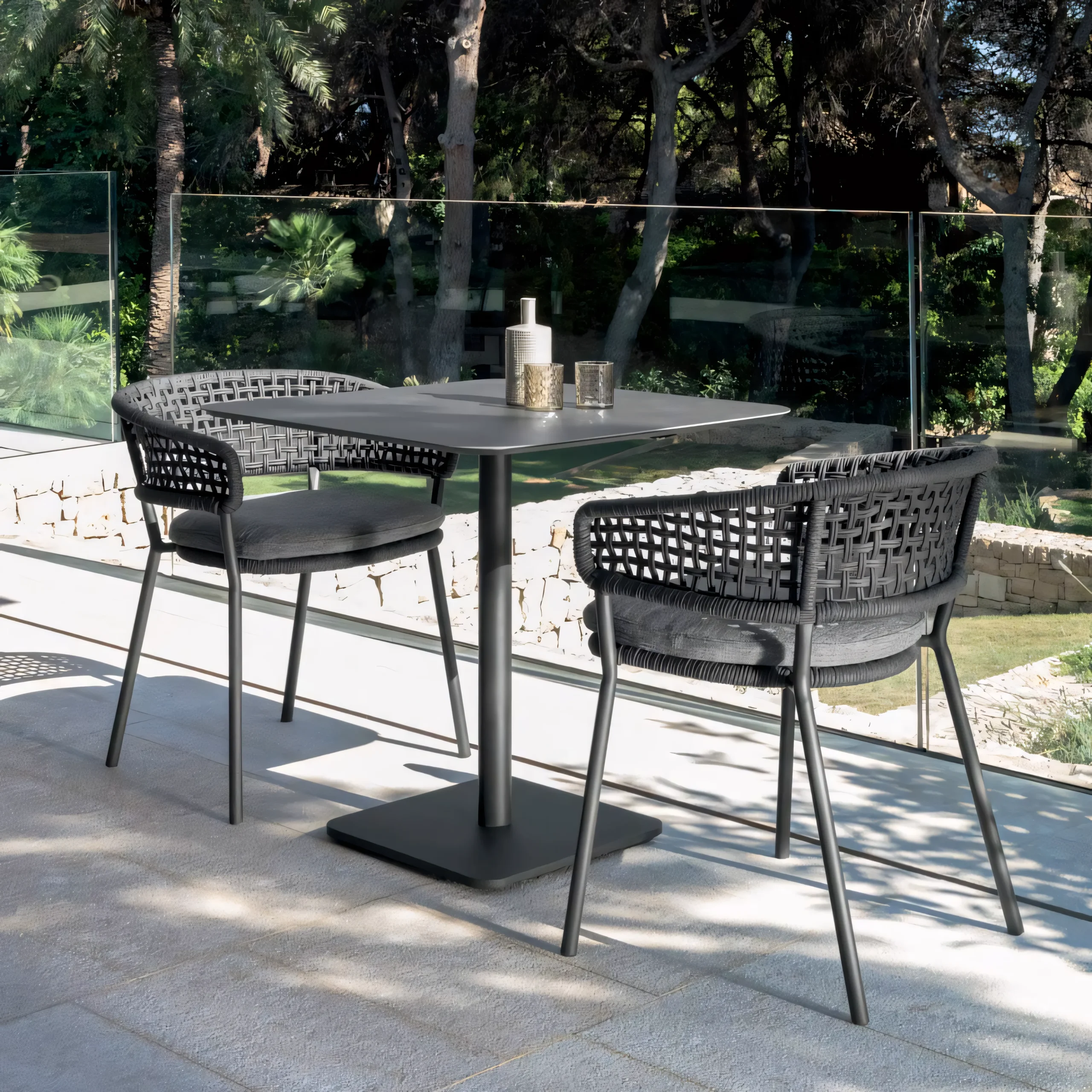 Modern Minimalist Rope Garden Dining Ensemble | Weather-Resistant Woven Patio Chairs with Stone Top Table