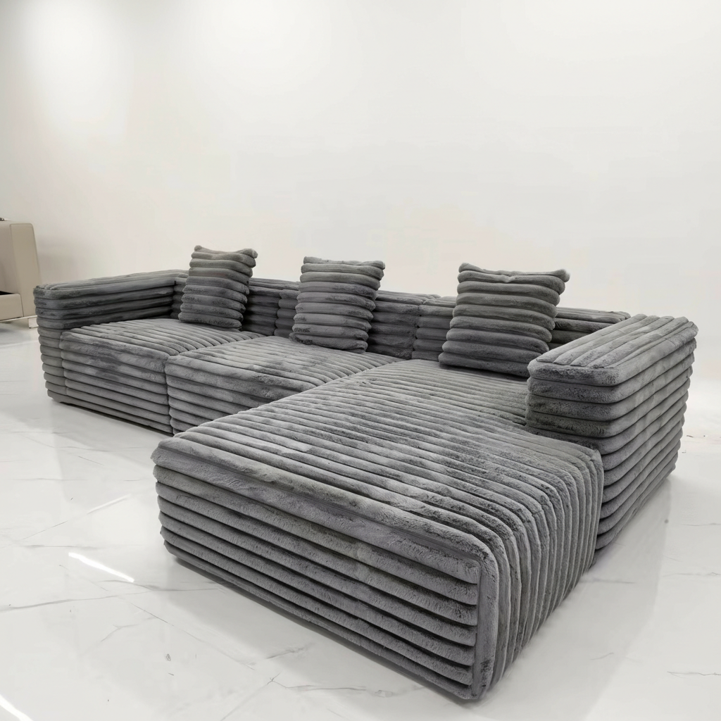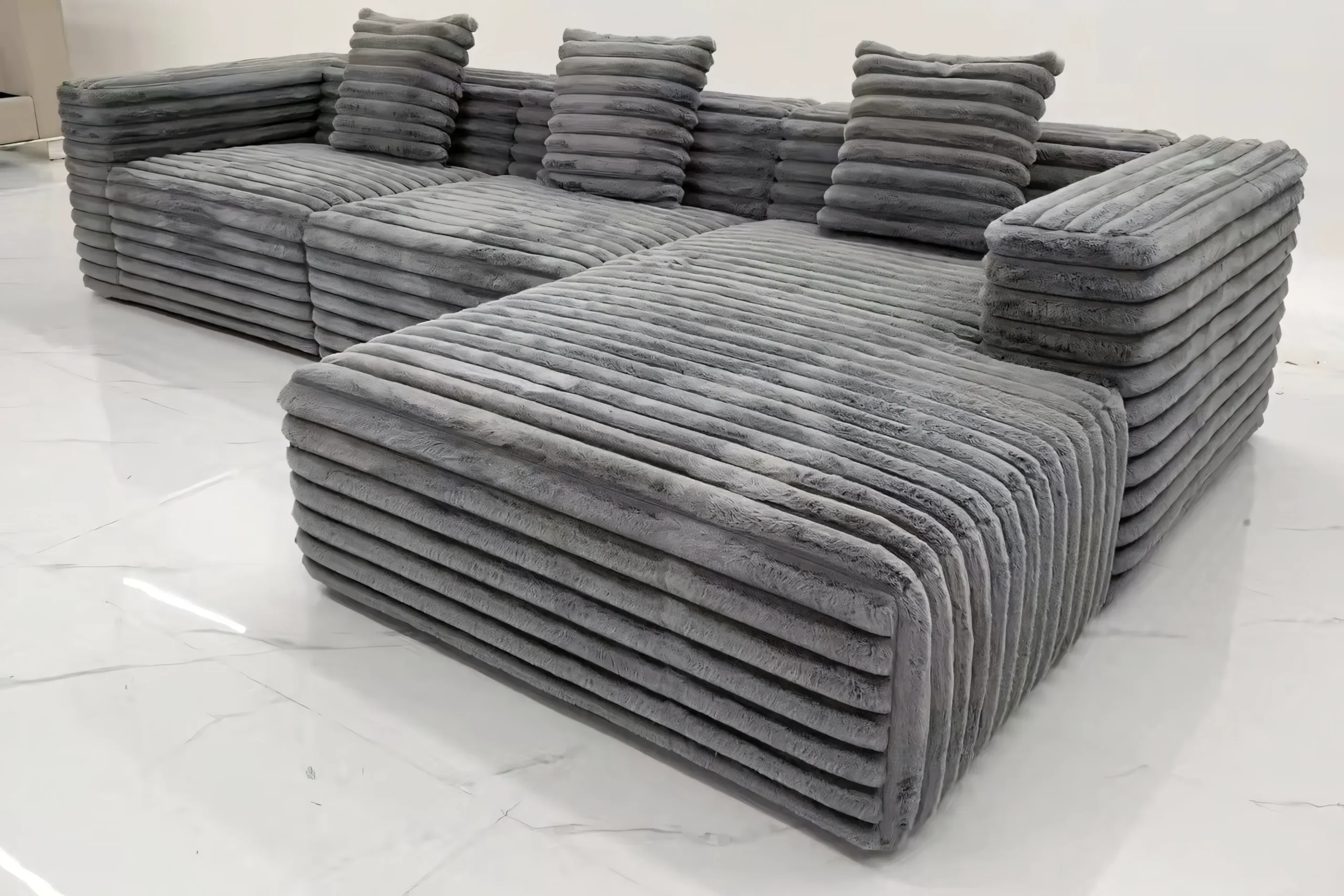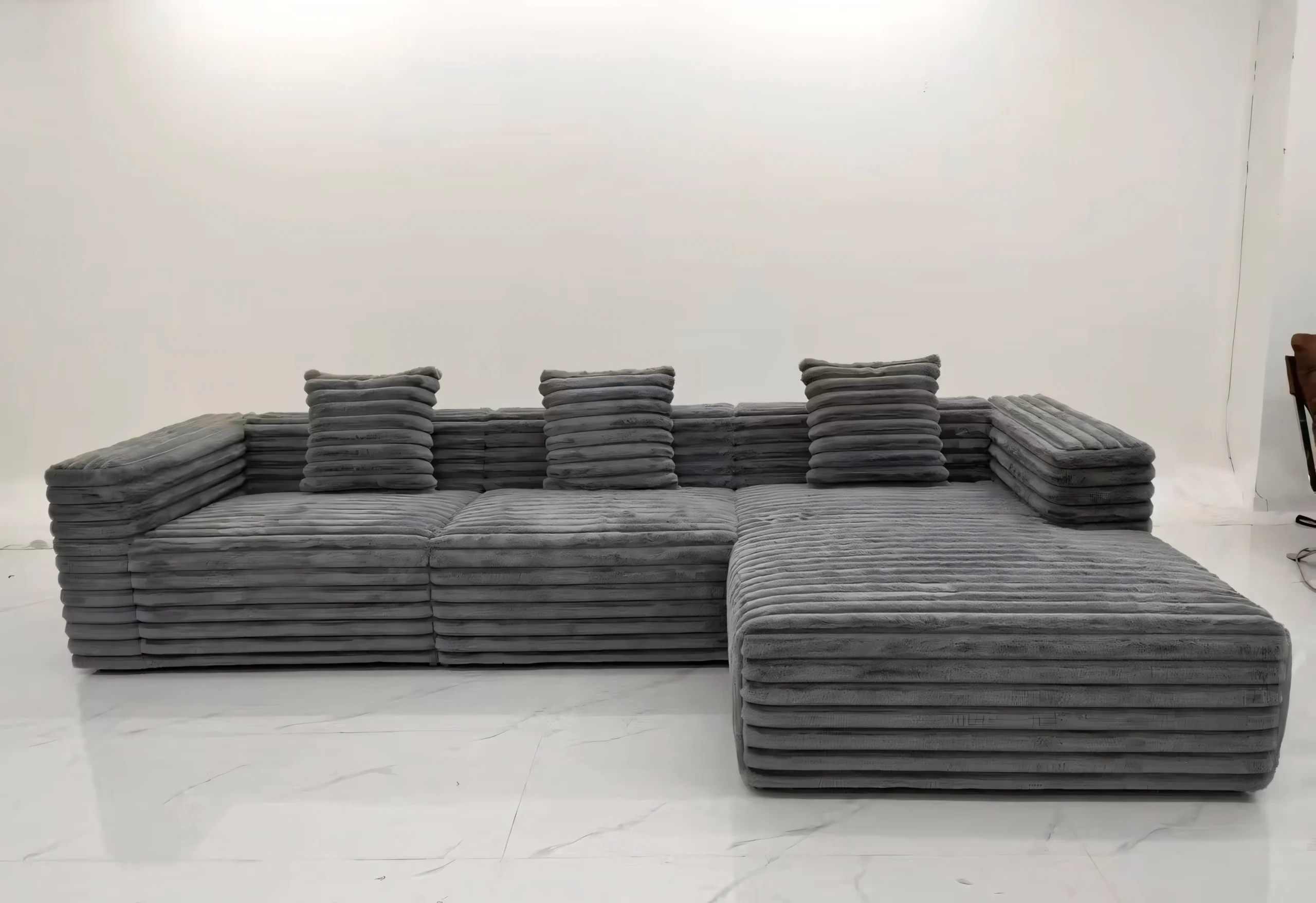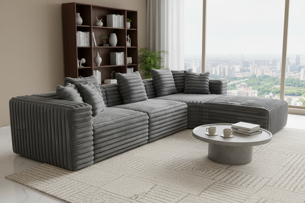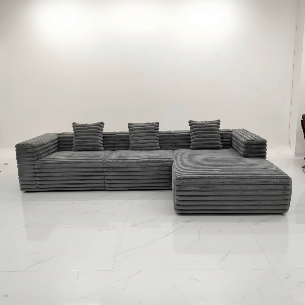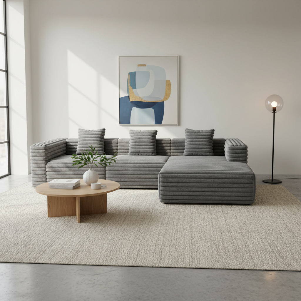 Experience the ultimate ‘sink-in’ comfort with this architectural masterpiece. Featuring a frameless high-density foam structure wrapped in tactile wide-wale ribbed velvet, this low-profile sectional offers superior support without hard edges. Perfect for modern lounging, its modular design allows you to customize the layout to fit any space instantly.