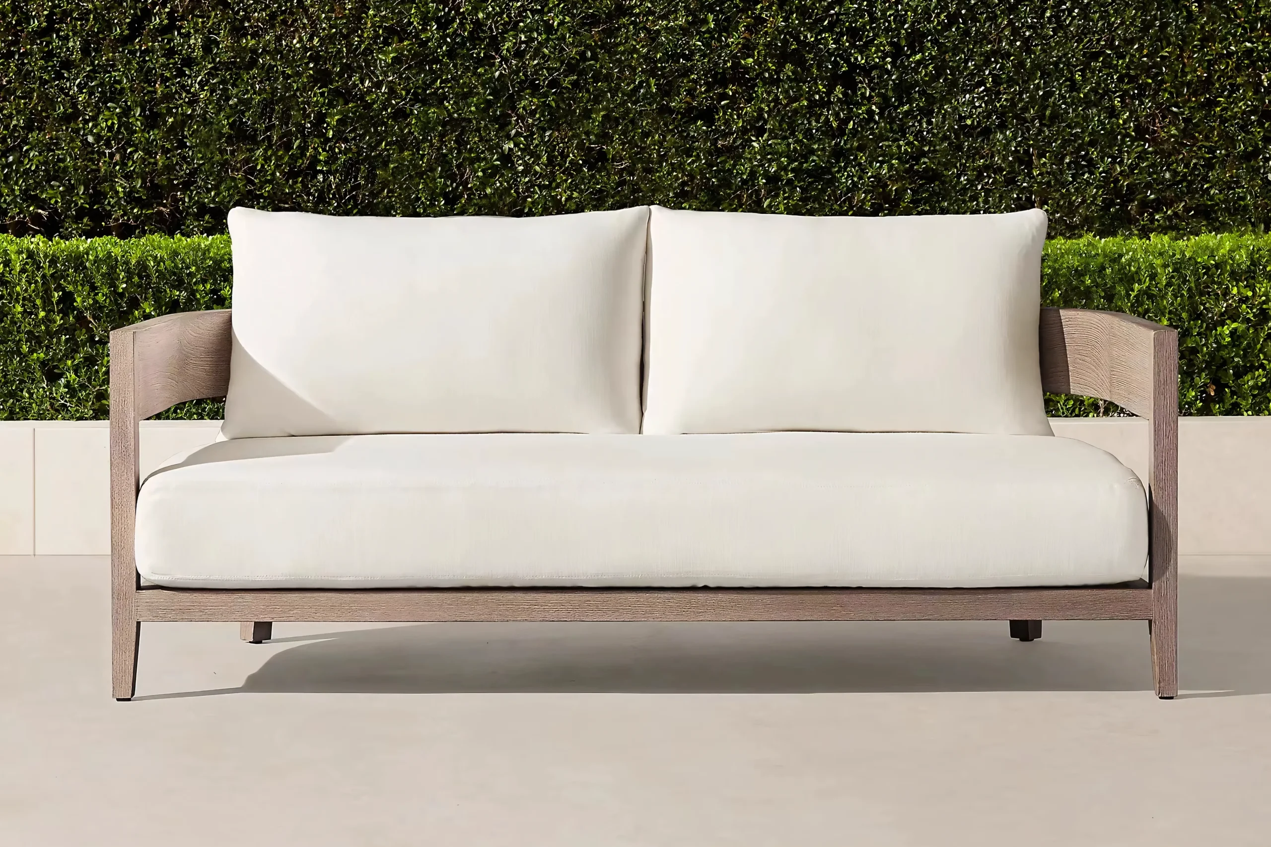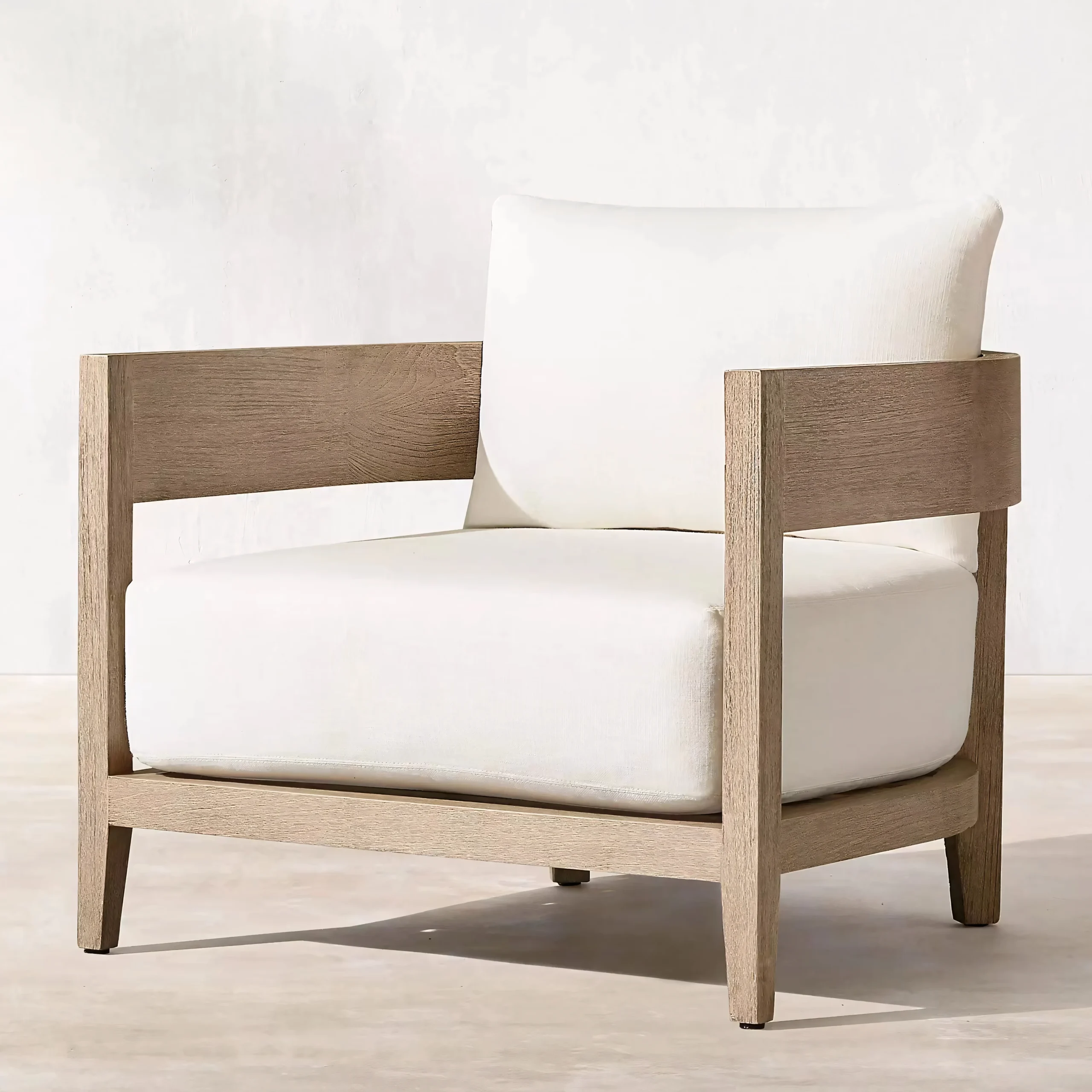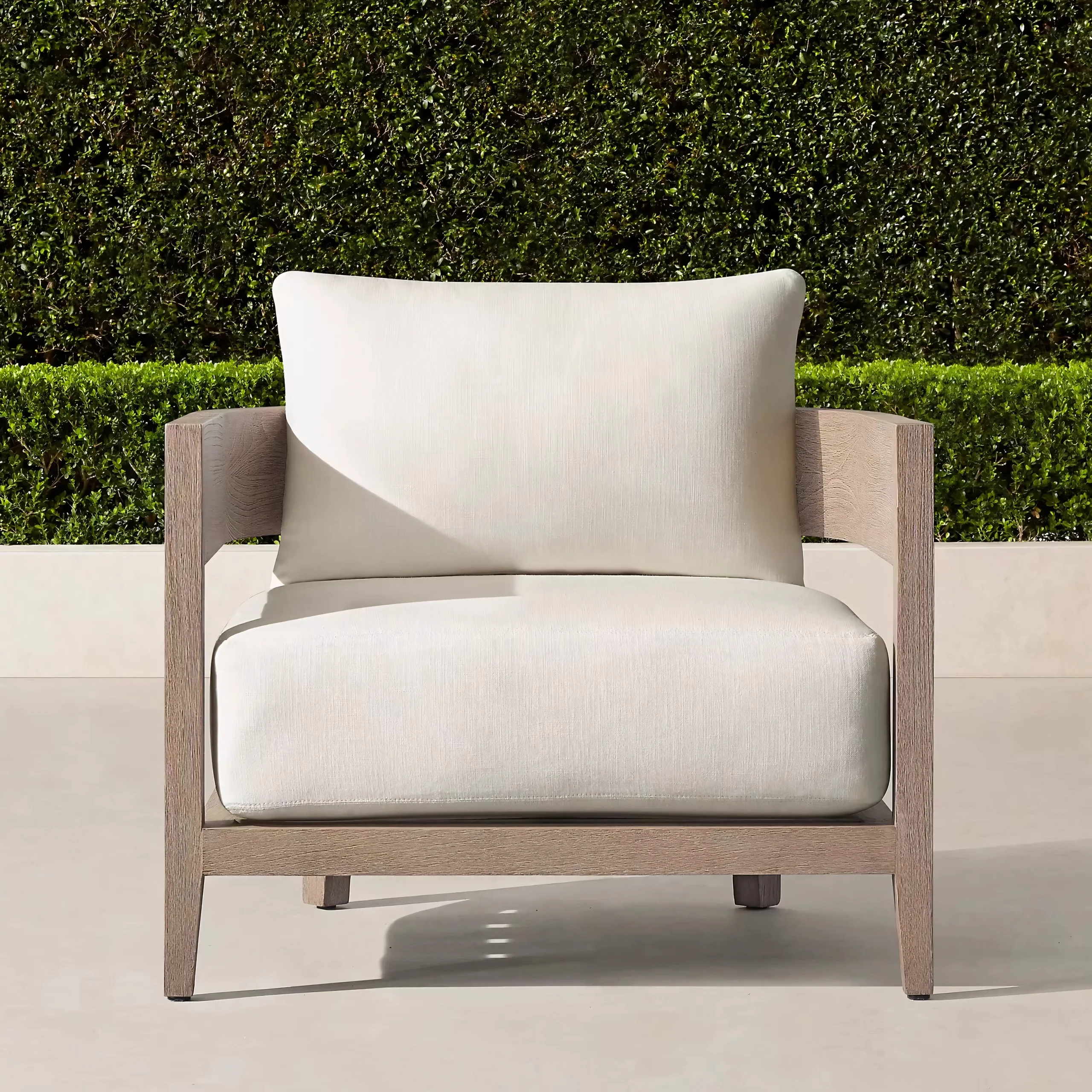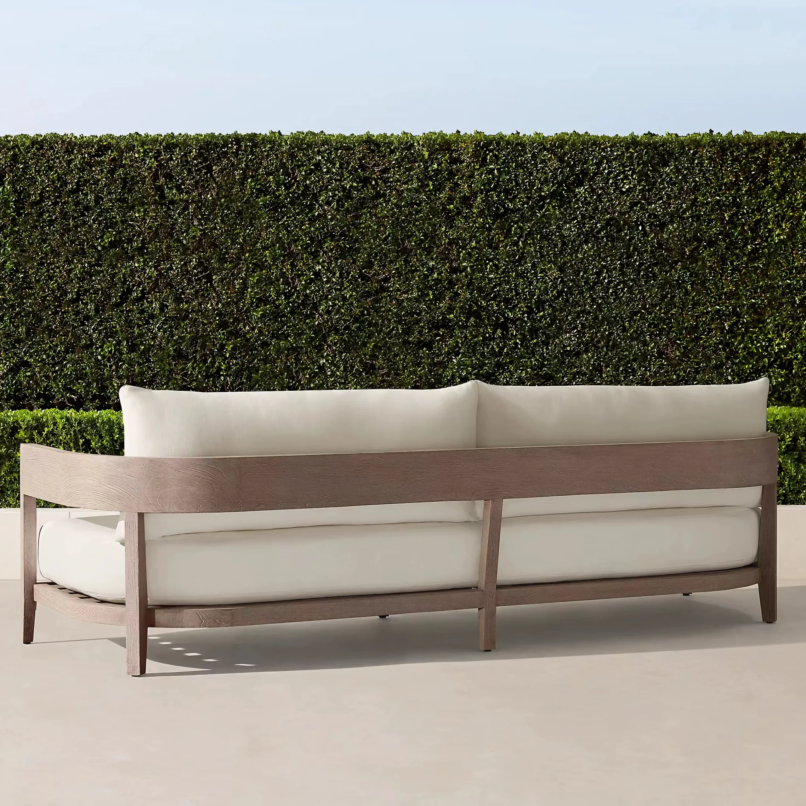 Hand-selected A-Grade teak wood provides the visual warmth of natural timber. Treated with a specialized weathered finish to mimic the grey patina of aged driftwood, it delivers that coveted "Restoration Hardware" aesthetic instantly, without waiting years for natural aging.
