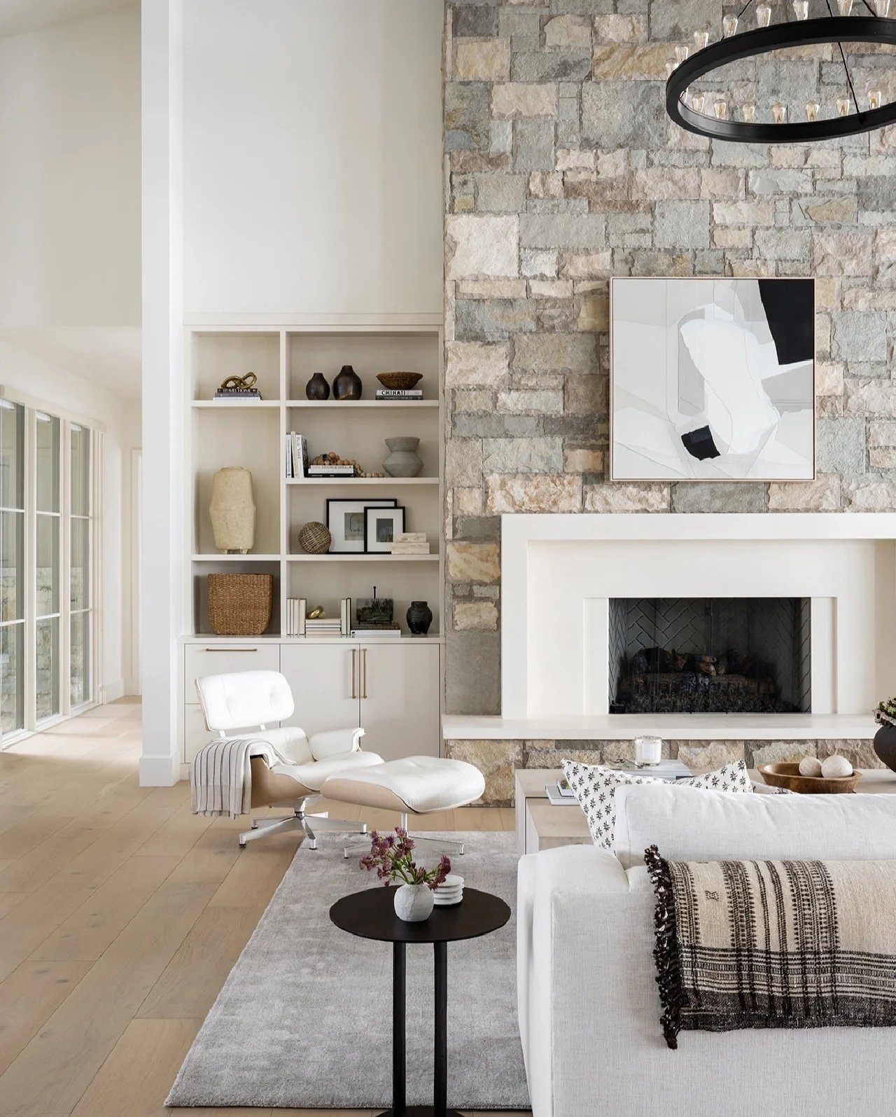 For this high-altitude apartment project, the challenge was to soften the rugged architectural elements—exposed stone fireplaces and vaulted timber ceilings—without compromising the modern aesthetic.